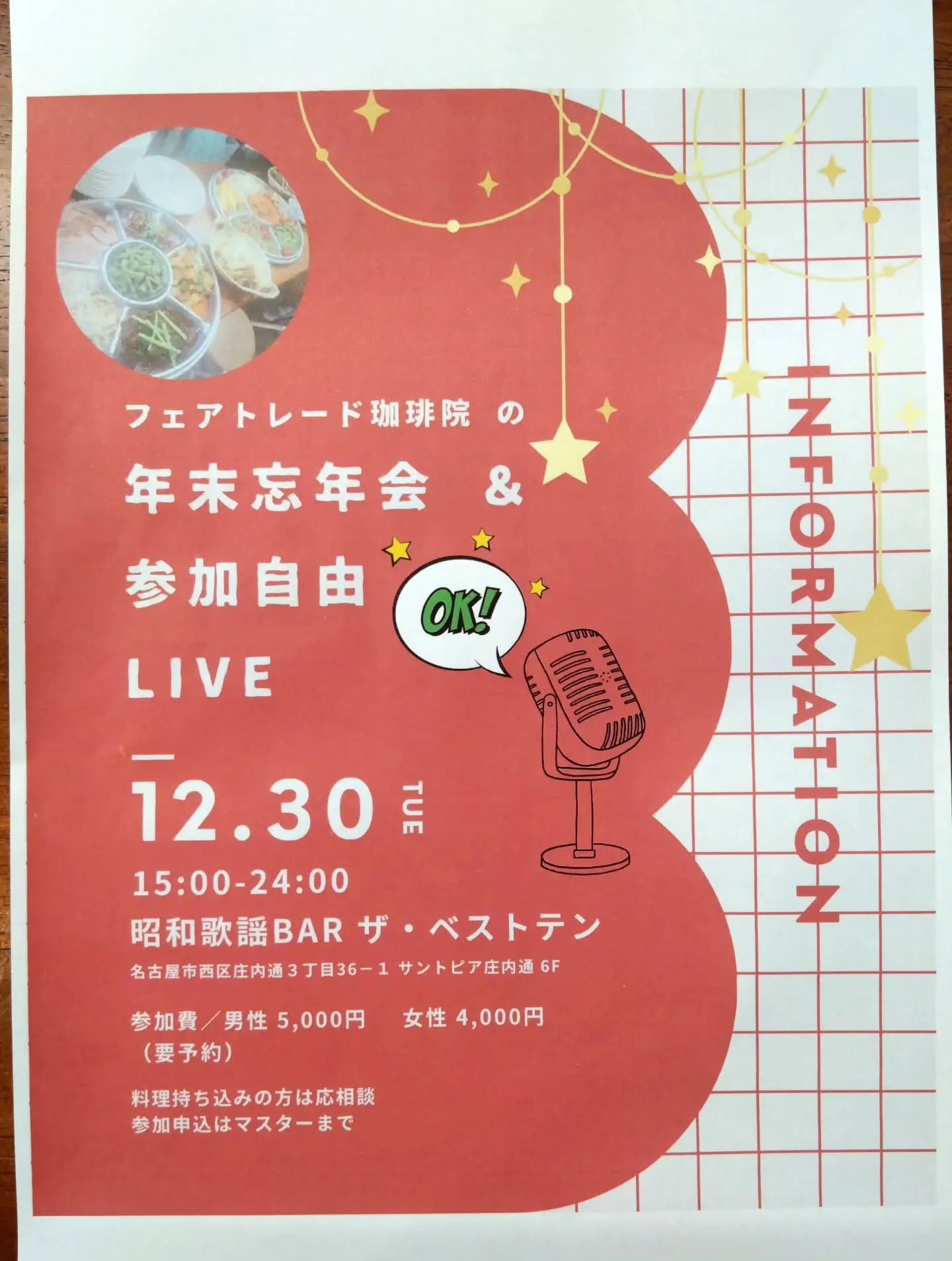 12月30日は常連客の要望で夏の2周年に続き、アコギ🎸生演奏でLIVEとみんなで歌って楽しむ忘年会を開催いたします。
