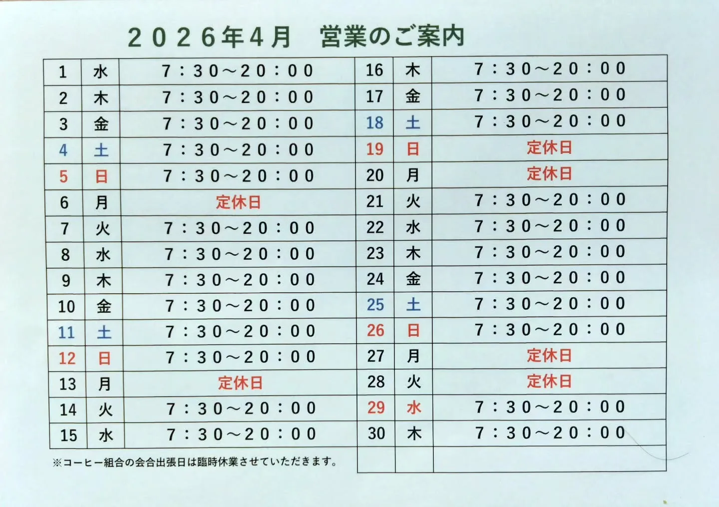 4月営業 休日案内☕